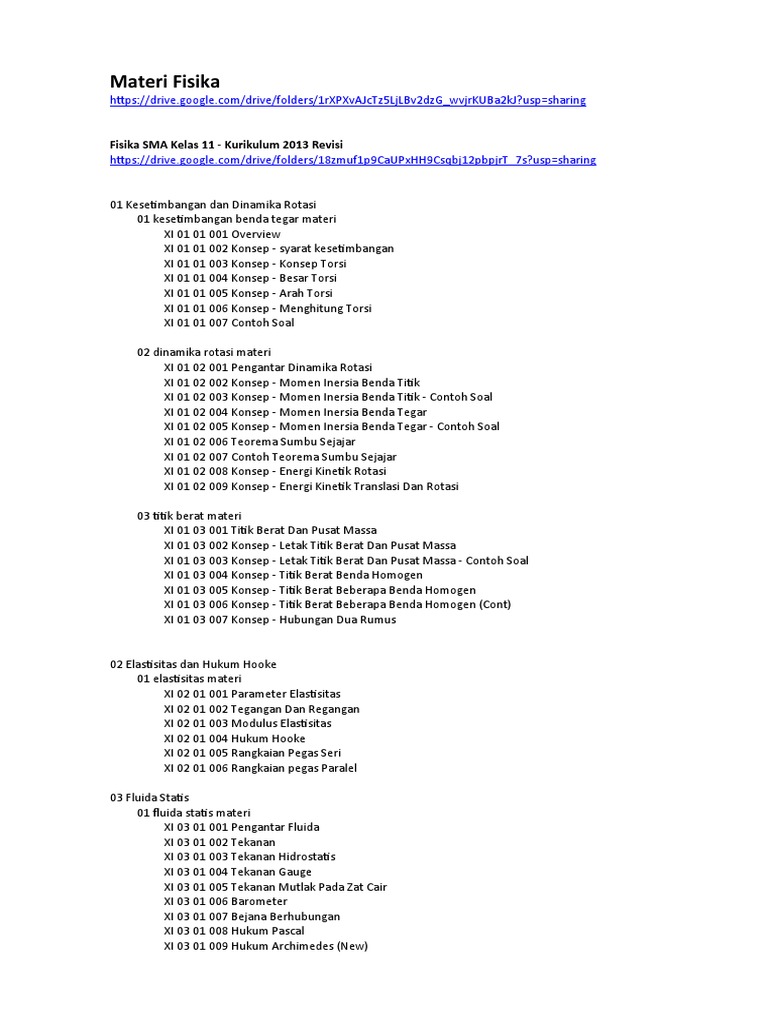 Halaman ini memuat daftar materi mata pelajaran fisika dengan kurikulum 2013 revisi. Materi fisika kelas 11 (xi). Termodinamika adalah ilmu yang mempelajari proses perpindahan energi dalam bentuk kalor dan usaha antara sistem dan lingkungan. Dinamika rotasi kesetimbangan titik berat. Adapun materi yang dibahas pada buku fisika kelas 11 sma / ma ini adalah