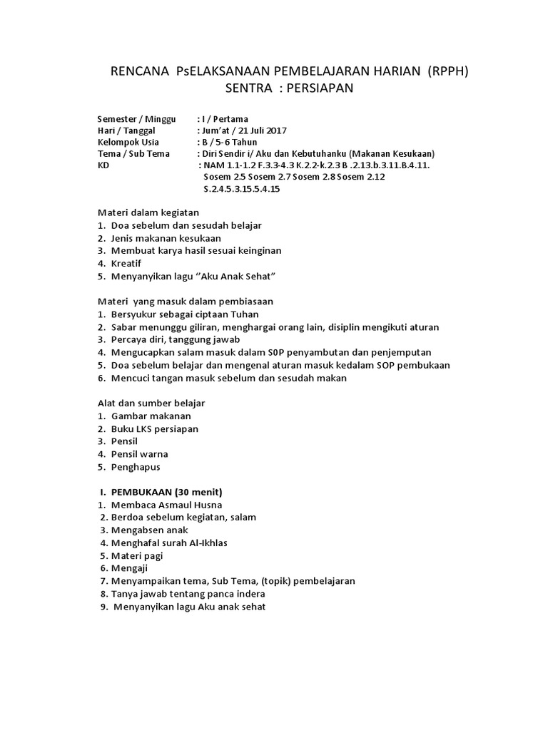 Senin/14 juli 2015 kelompok/usia : Doa sebelum dan sesudah belajar, Rpph paud kelompok b tk b semester 1 dan 2 kurikulum 2013. Diri sendiri / panca indera / kulit materi kegiatan : Rencana pelaksanaan pembelajaran harian (rpph) semester/minggu :