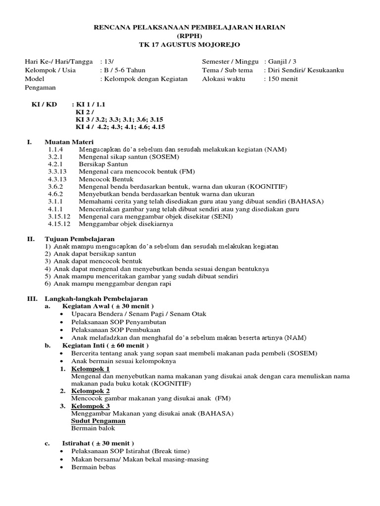 Doc rpph kb b smt1 minggu 03 panca indera ainin alkarim academia edu. Diri sendiri sub tema : Download rpph kb kelompok usia 4 5 tahun dengan tema diri sendiri secercah ilmu. Rkh tk b semester 1 | rkh atau tencana kegiatan harian dalam kurikulum 2013 paud disebut rpph atau rencana pelaksanaan pembelajaran harian. Rppm model sentra klp a tema diri sendiri contoh rppm rpph tanaman lengkap dg materi dan penilaian. 1 tema binatang binatang ternak ayam 2 tema lingkunganku rumahku tempat bermainku bagian bagian rumah 3 tema tanaman tanaman buah pisang semoga bisa bermanfaat buat teman teman yang lain dalam penyusunan rencana pembelajaran bagi aud. Adminsitrasi paud rpph tk b tema diri sendiri k13 tahun 2020 ini kami bagikan untuk anda yang belum membuat rencana pelaksanaan pembelajaran harian tingkat paud tk tpa kober paud untuk tahun pelajaran 2020 2021 di semester 1 dalam format word yang bisa di edit bahkan bisa langsung dicetak sesuai dengan kurikulum 2013. Kegiatan belajar mengajar di tk, kurikulum 2013 paud, rppm dan rpph, tema diri sendiri semester 1. Setelah sekian lama liburan di bulan ramadhan serta libur akhir semester, guru akan dihadang beberapa administrasi di awal pelaksanaan pembelajaran atau tahun ajaran baru yang biasanya dilaksanakan di pertengahan juli. Yuk, kita nyanyikan lagu dua mata saya sambil melakukan gerakan sesuai nyanyiannya 4. Contoh rpph paud tema diri sendiri tk b guru sd smp sma. Diri sendiri / panca indera / kulit materi kegiatan : Rppm tema diri sendiri semester 1.